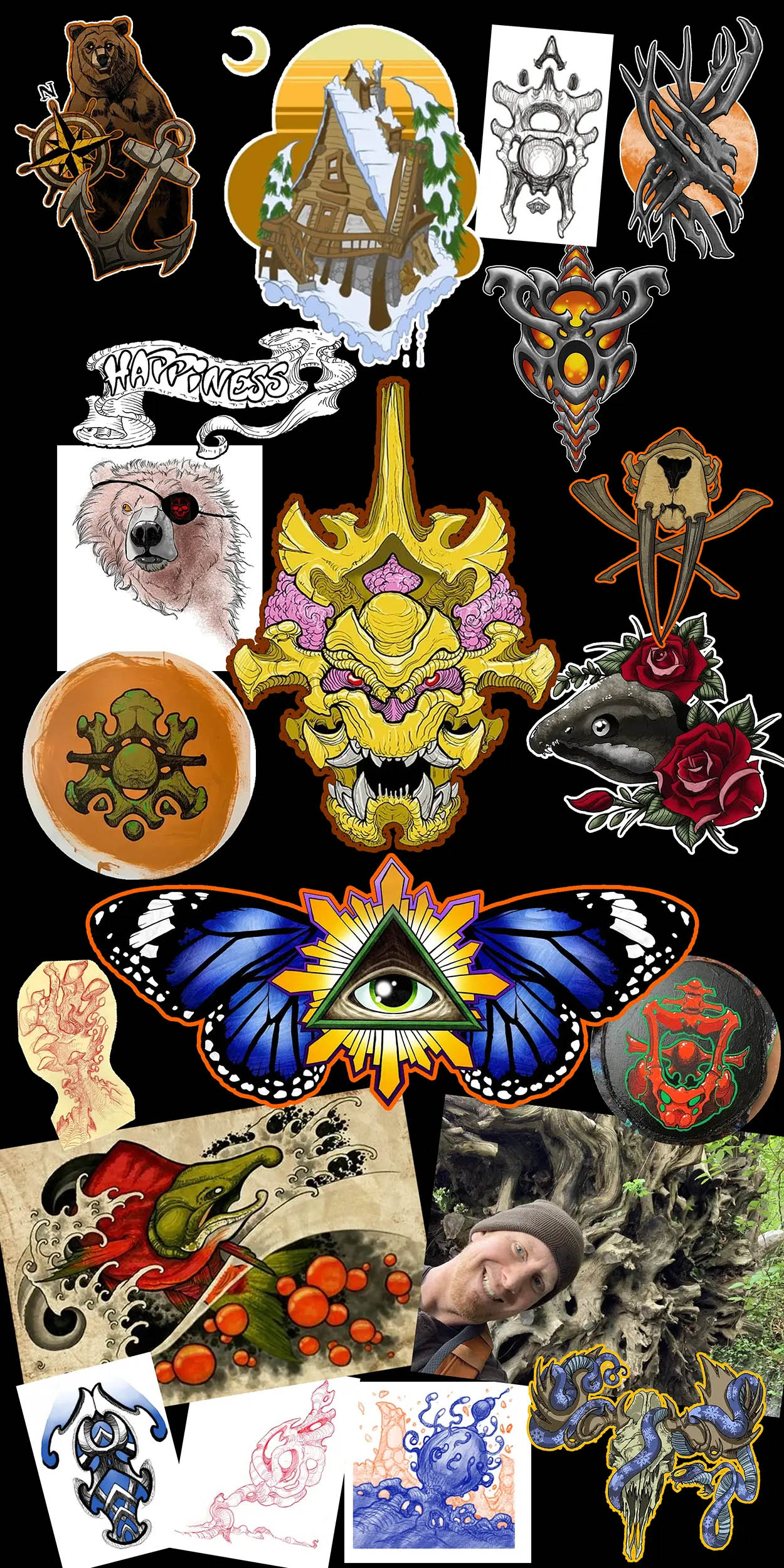 Original paintings and drawings available in the studio. Many designs are available for tattooing at a slight discount — labors of love looking for a new home.