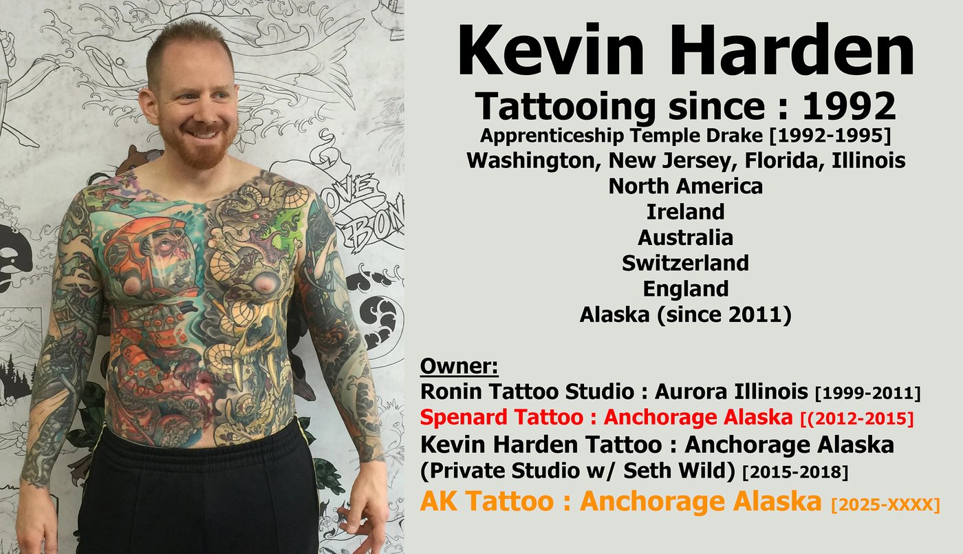 Kevin started his tattoo journey January 1992, apprenticing under Temple Drake @ Tattoo Technique in Bremerton, Washington. Over 34 years later, he's still at it — and still loves every minute.